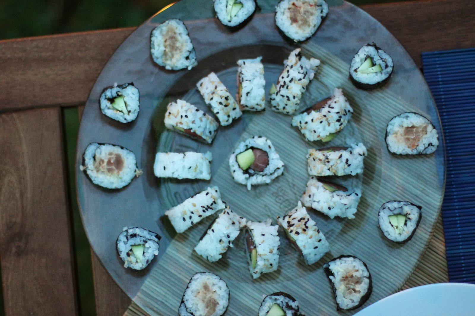 - Uramaki: Sempre con il tappetino, ma stavolta foderato con la carta trasparente, appoggiare l'alga. Coprire con il riso, cospargere con sesamo bianco e nero. Capovolgere l'alga. A questo punto avrete il riso a contatto col tappetino e l'alga vuota davanti a voi. Farcire con salmone e avocado, tonno e avocado, o qualsiasi cosa vi venga in mente. Chiudere il rotolino come fatto prima chiudendo ben stretto. Dividere in due e ogni parte in 3